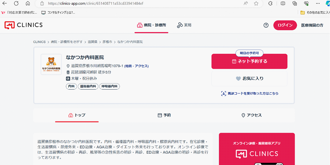 | ① CLINICSのトップページから「ログイン」をクリックします |